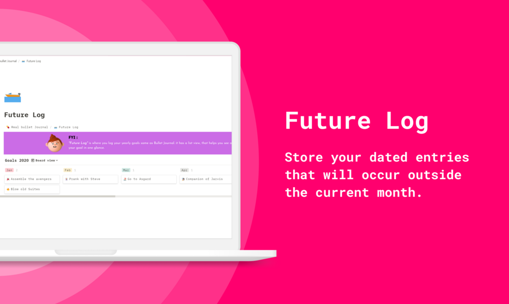 This Collection is used to store dated entries that will occur outside the current month. The Future Log serves as your time machine, allowing you to glimpse the outlines of the future you're actively working towards. It has two views